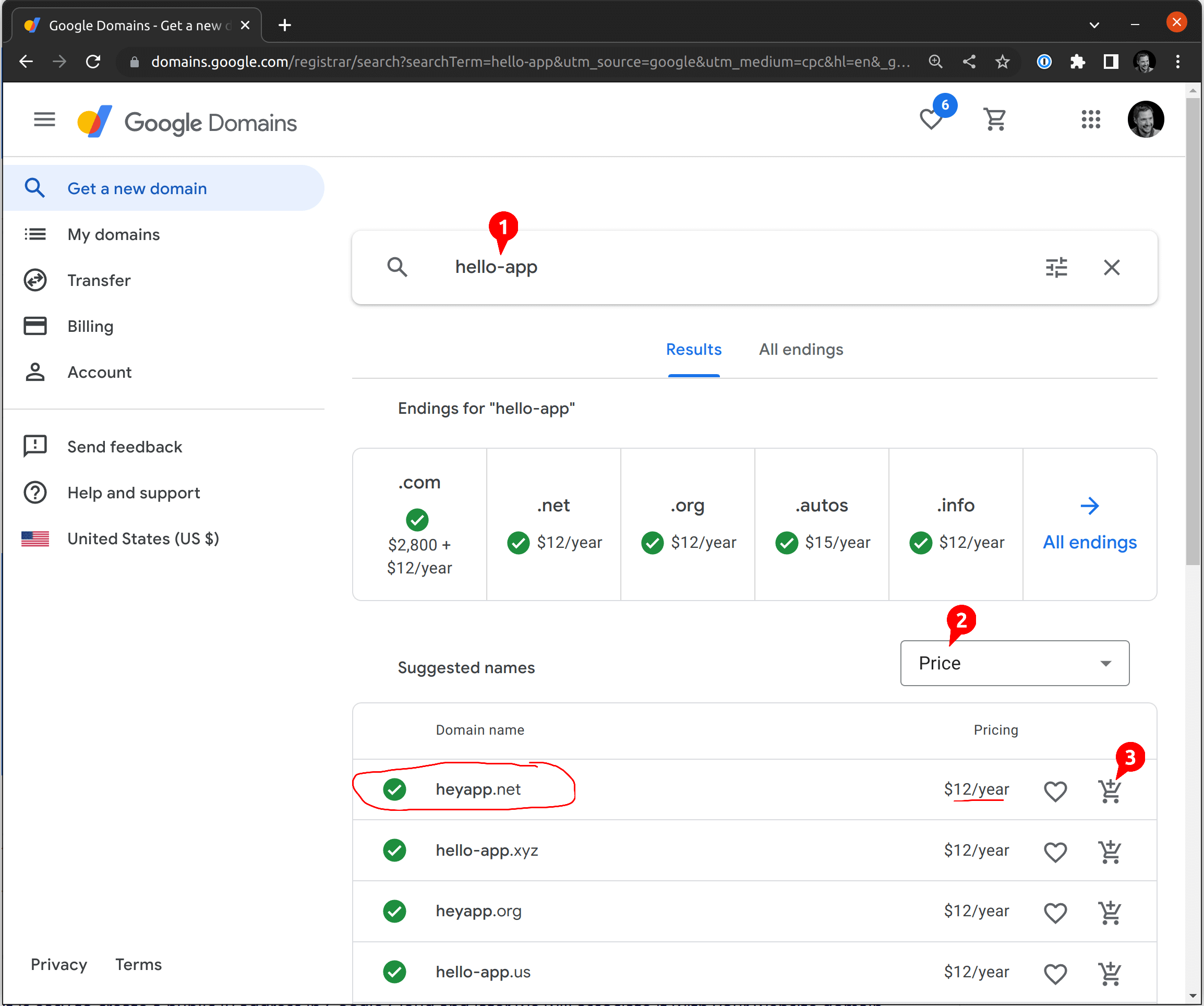 We will purchase a cheap domain name using a credit card. Go to https://domains.google.com, and type something in the search box. For the example, we searched for hello-app.com because the example container that we will be deploying is called hello-app. Most importantly, we make sure to sort the domain names by price: