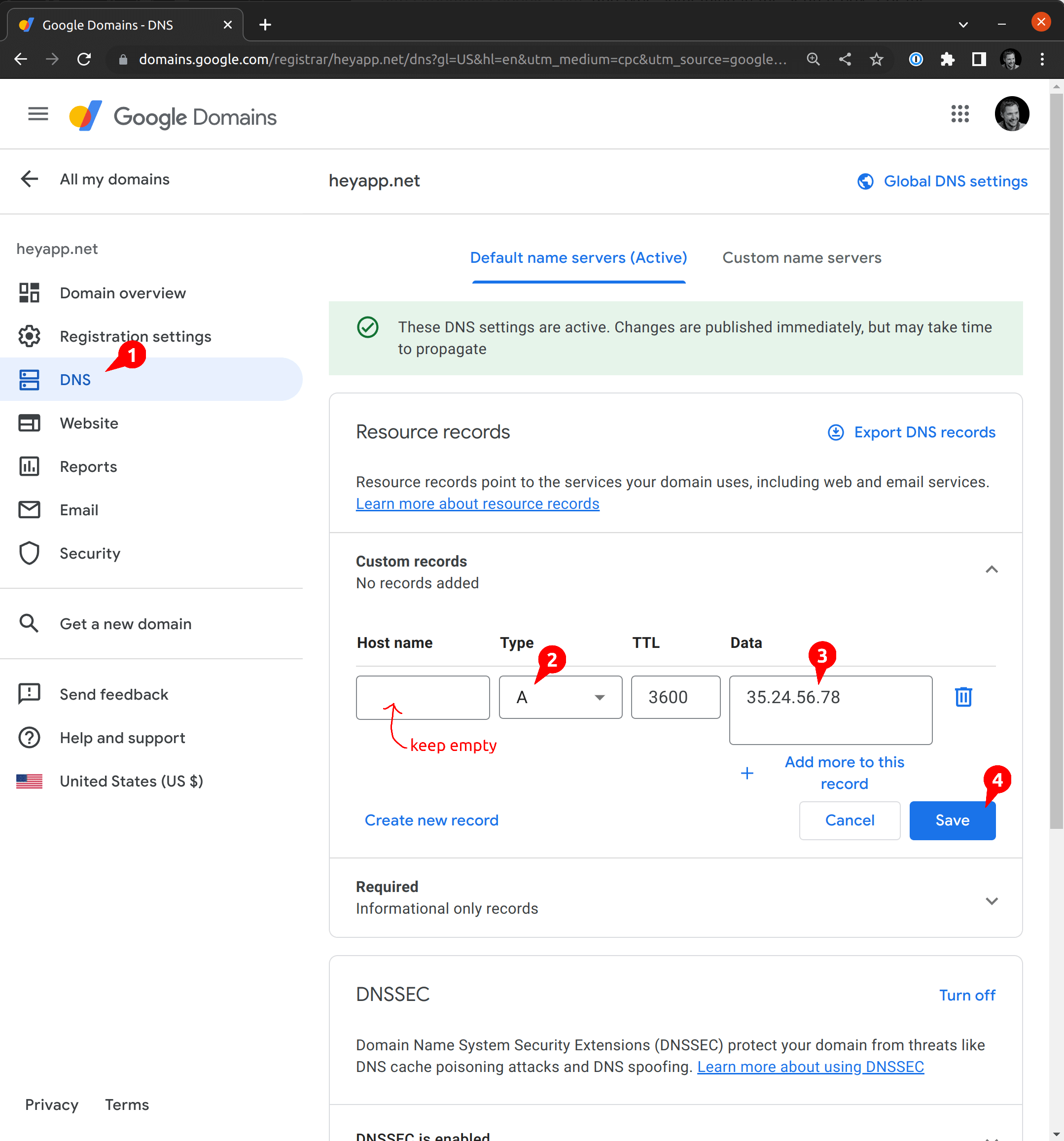 Next, you will need to create a new A record pointing at the IP address that we created above. Head back to https://domains.google.com/registrar, open your domain (here, heyapp.net) and click "DNS" on the left menu. You will see "Custom records". You want to add a new record of type A and put the IP address from the previous step into "data". You must leave "Host name" empty because we are configuring the top-level domain name: