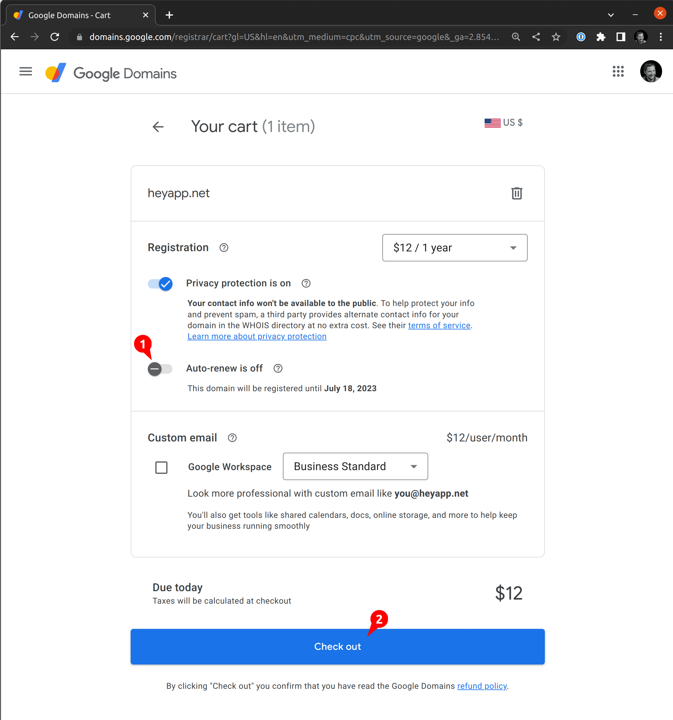 We don't pick hello-app.com because it costs $2,800; instead, we go with the one at the top: heyapp.net. It looks good! We then click the cart button. On the next screen, you will want to disable the auto-renewal, since we don't want to pay for this domain every year: